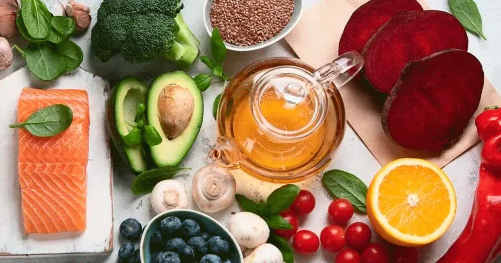 - Frutas e Vegetais Coloridos: Cenoura, espinafre e frutas cítricas têm vitaminas A e C, que renovam a pele e combatem radicais livres.